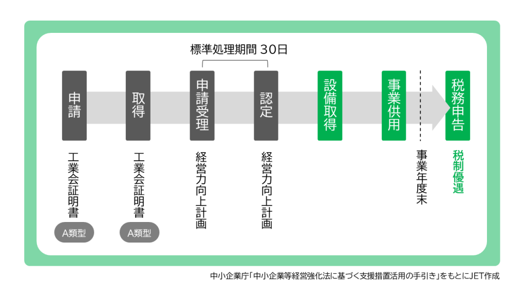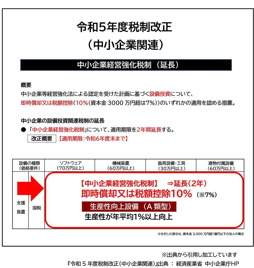 The “Tax System for Enhancing SME Management” allows small and medium-sized enterprises to receive immediate depreciation or a tax credit of 10% of acquisition cost (7% for corporations with capital between 30 million and 100 million yen) when acquiring designated equipment under an approved Business Capability Enhancement Plan.